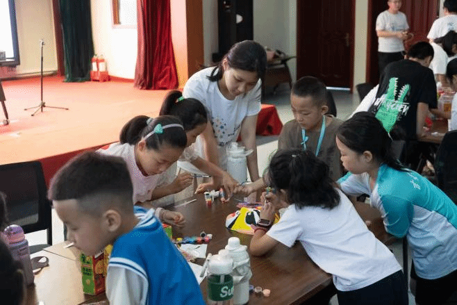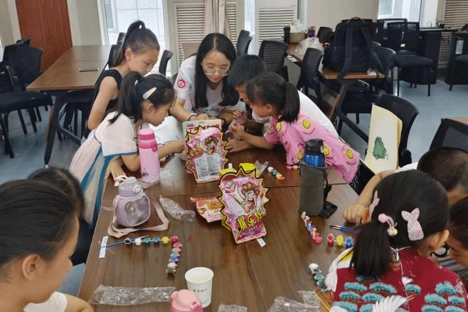 实践队成员指导青少年们进行脸谱创作
